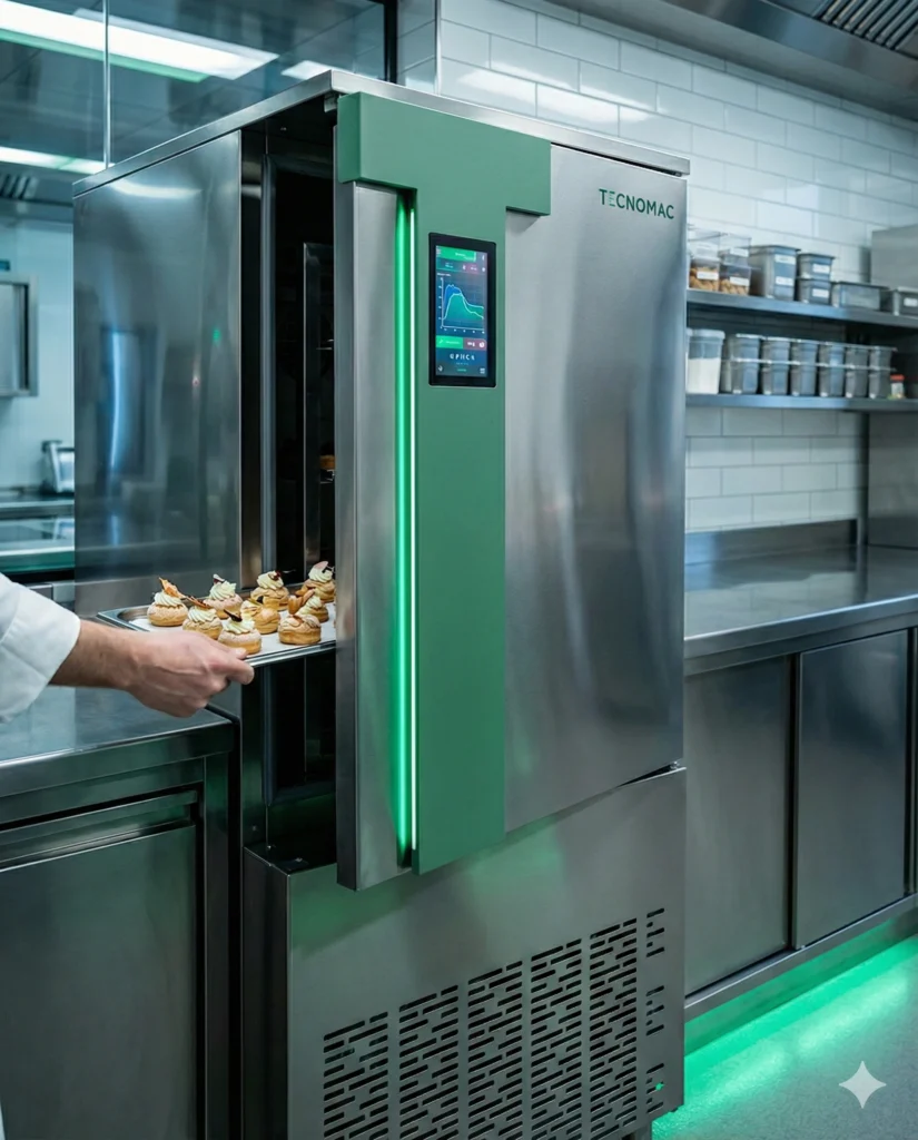 🥐 Втасване (Retarder Proving): Забравете ставането в 3:00 сутринта. Заредете кроасаните от предния ден. Машината ги държи “спящи” (студени), след което автоматично включва подгрев и влага, за да втасат точно за началото на смяната в 8:00 ч.