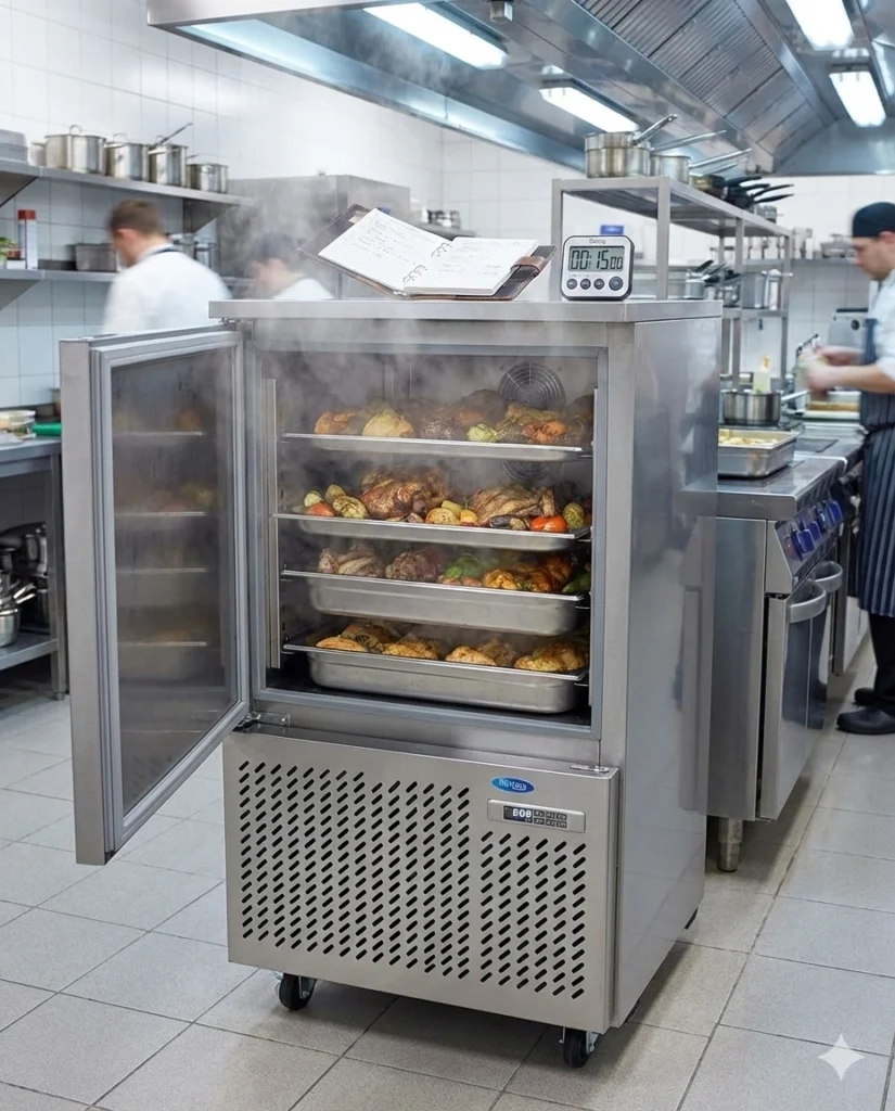 Стоп на Фирата (Food Cost): Горещата храна, оставена да изстива сама, губи влага (изпарение). Това е директна загуба на тегло и печалба. Шоковият охладител “запечатва” влагата веднага. Спестявате около 5-8% от теглото на всяко печено месо.