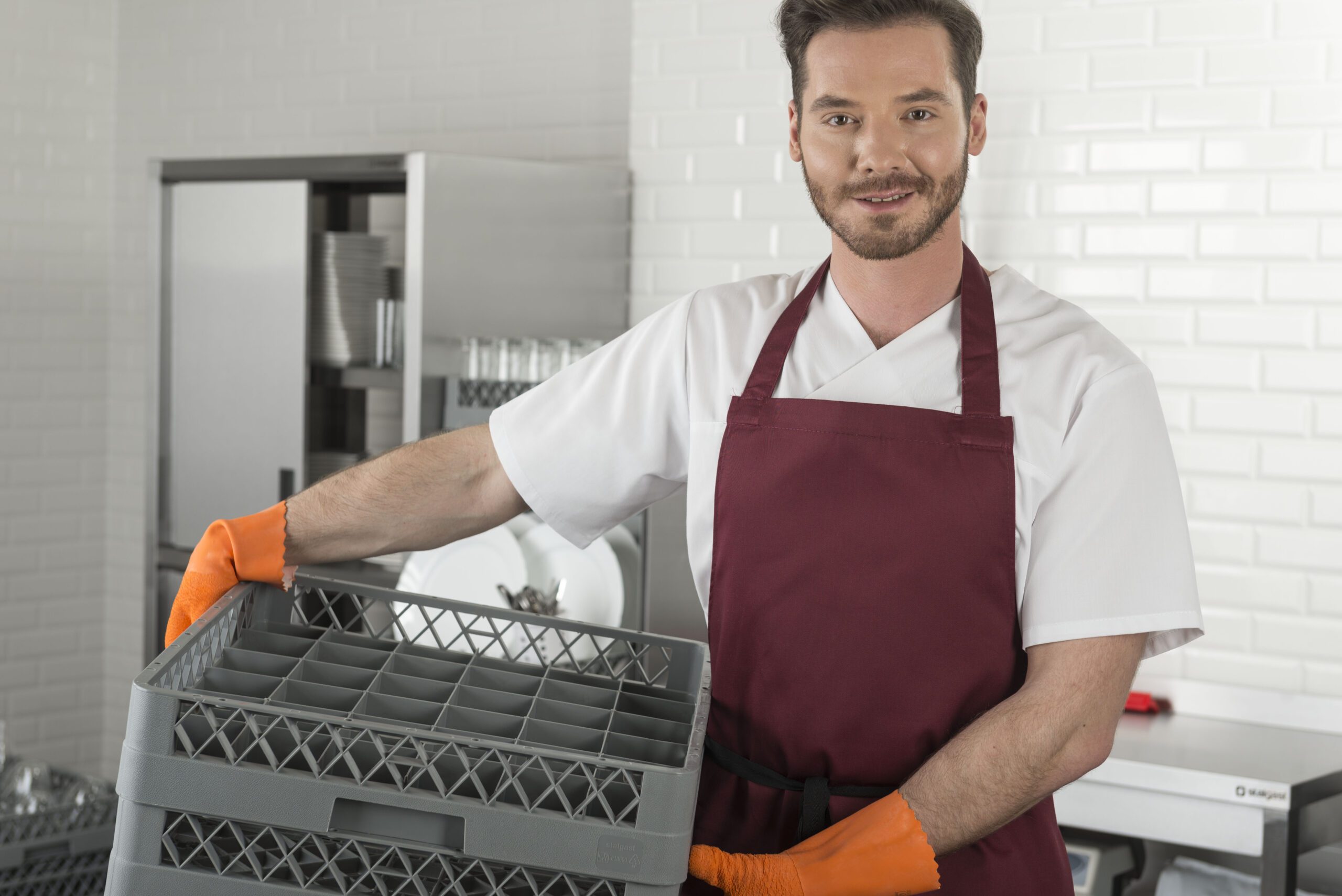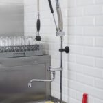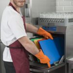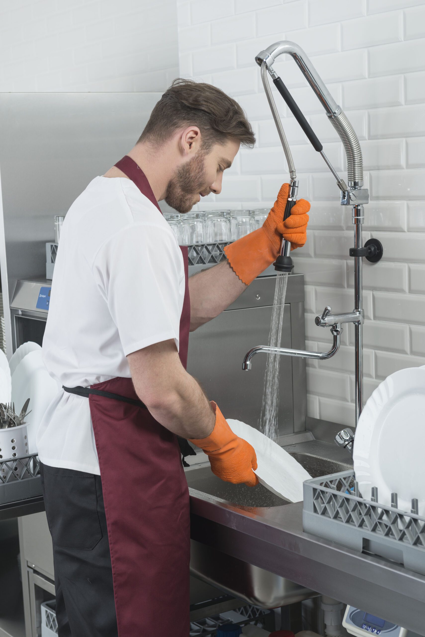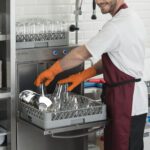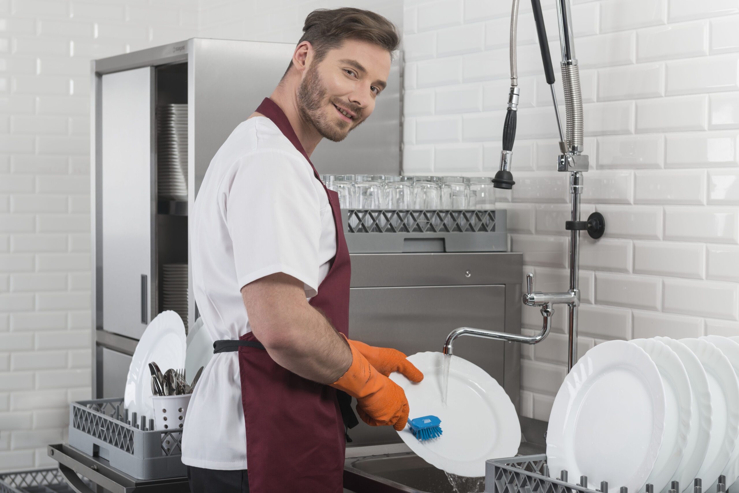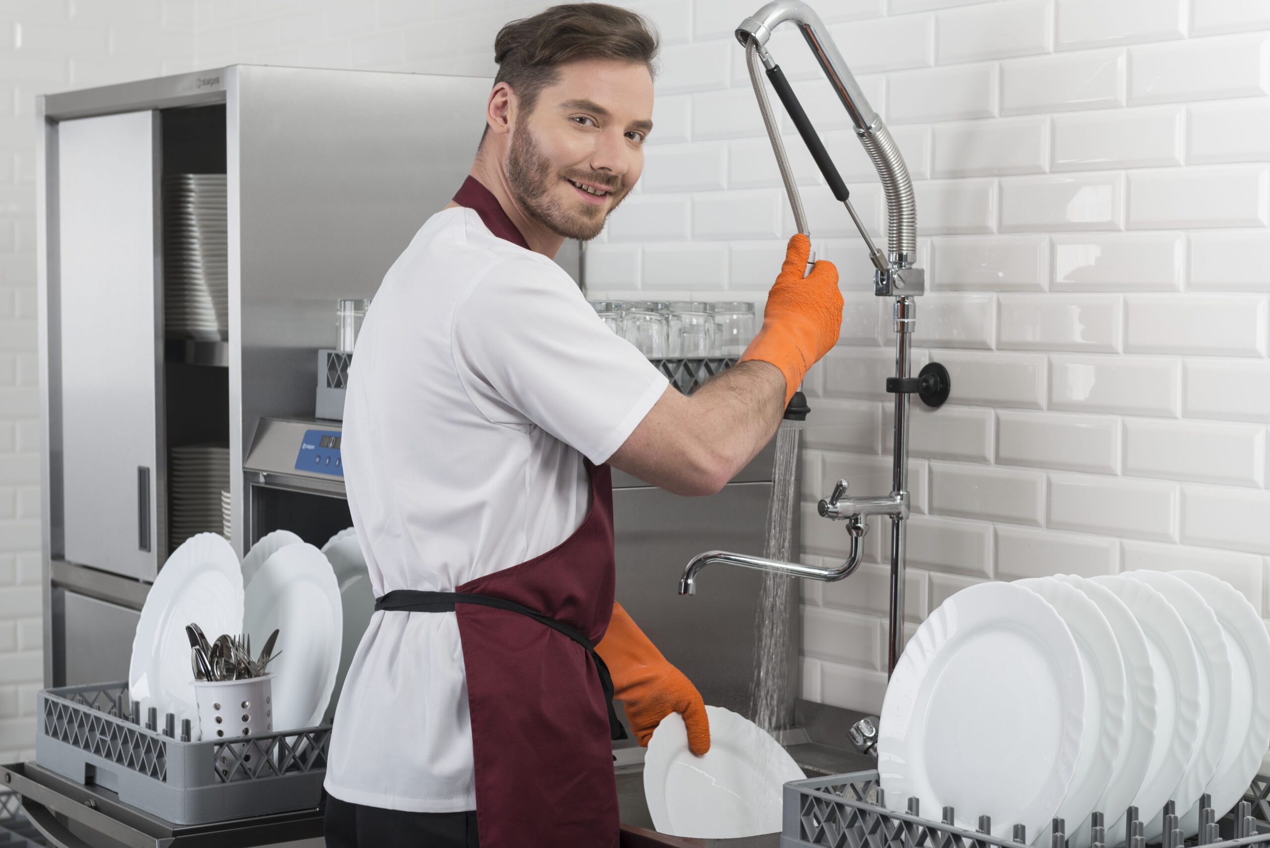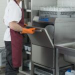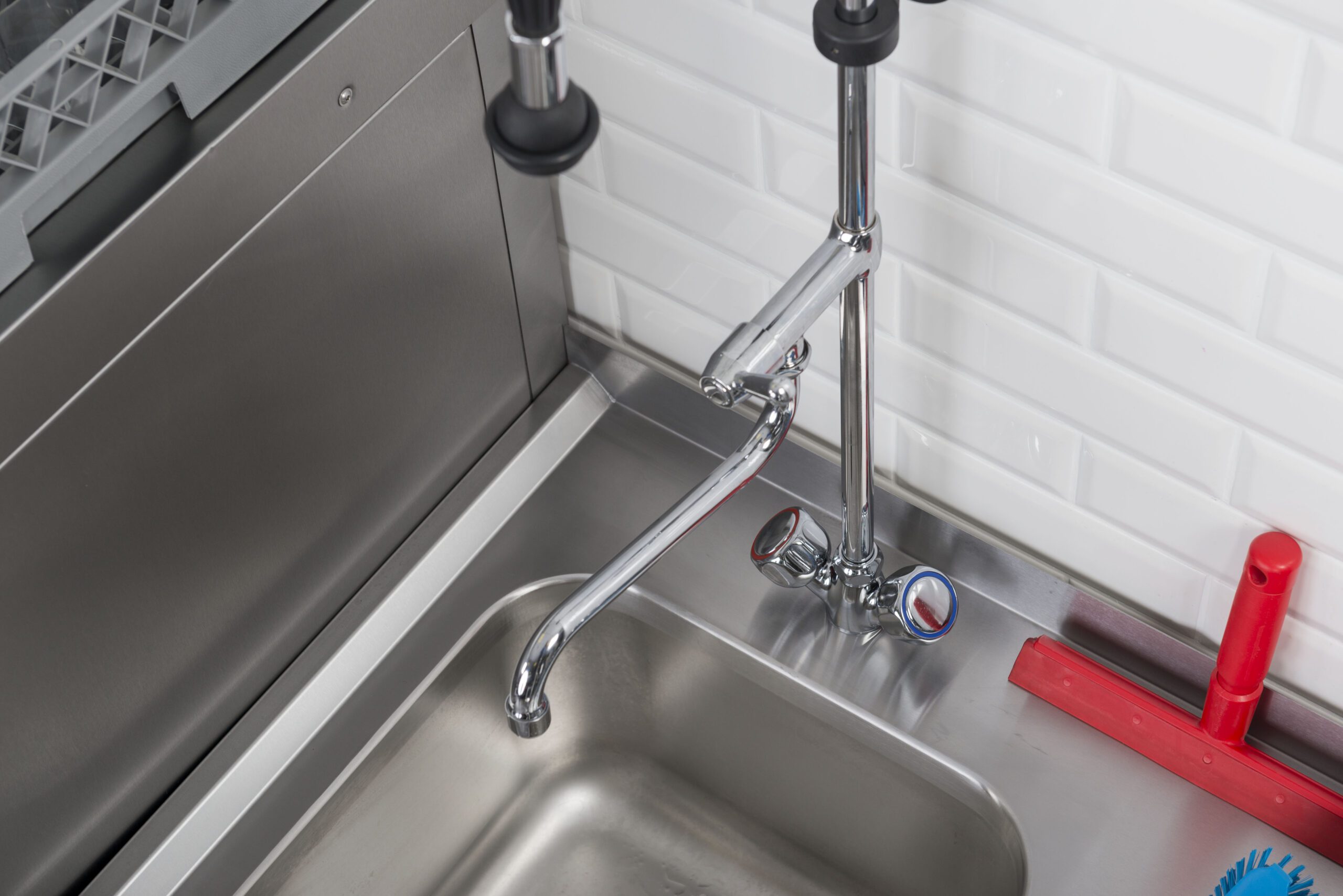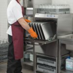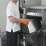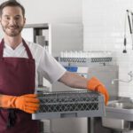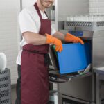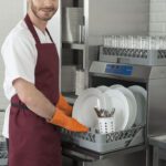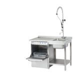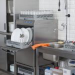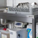 - Правилото “Мръсно-Чисто”: Трябва ви “Входяща маса” с мивка и душ за предварително отмиване (Pre-wash) и “Изходяща маса” за изсъхване на чистите кошници. Това създава поточна линия, където мръсните и чистите съдове никога не се срещат.