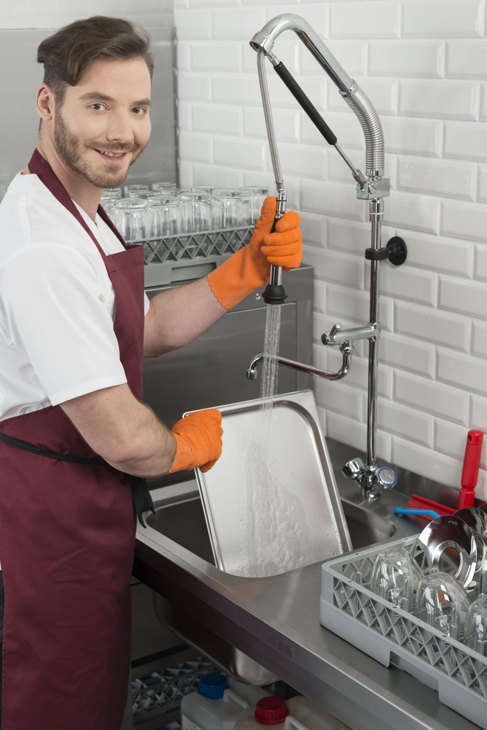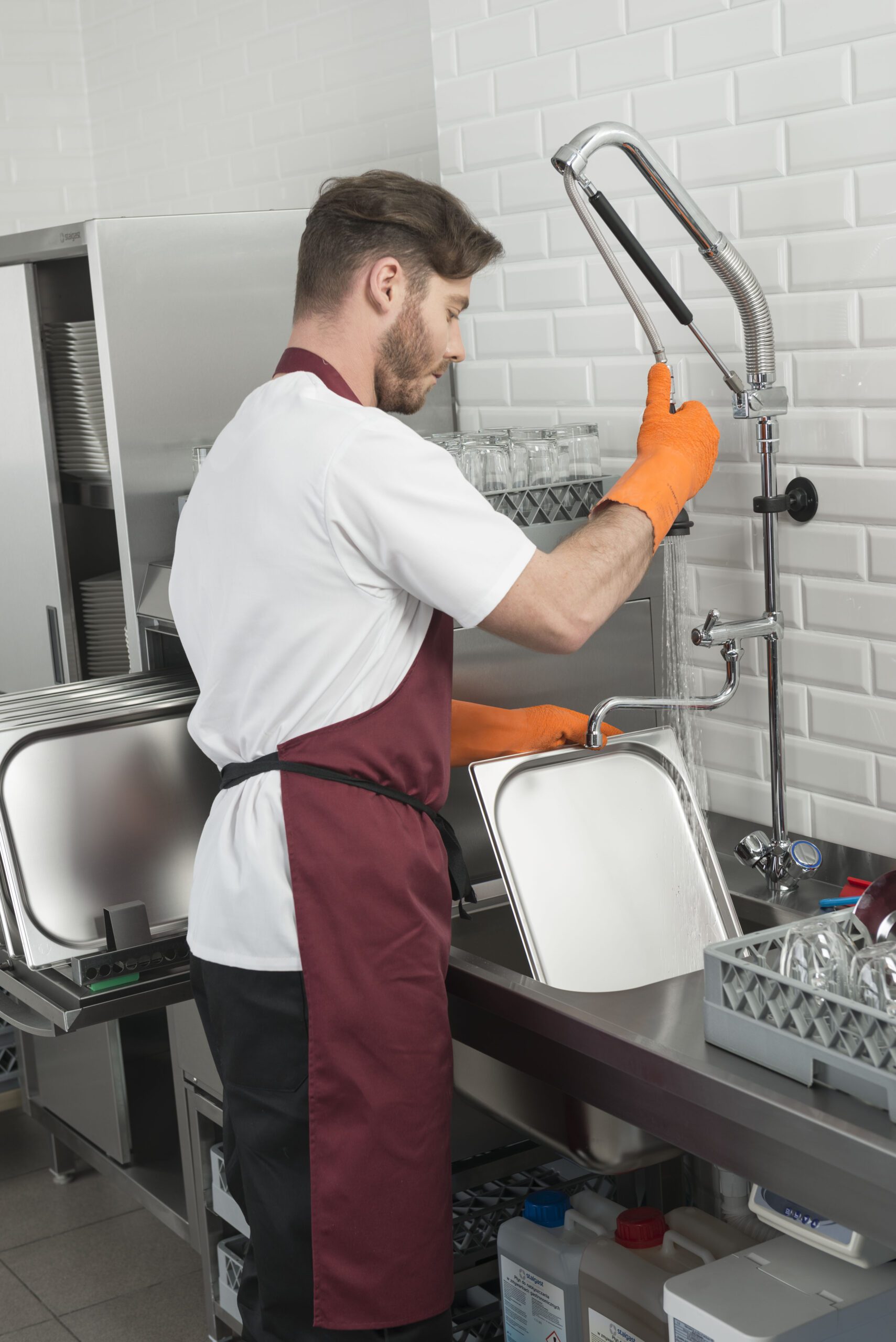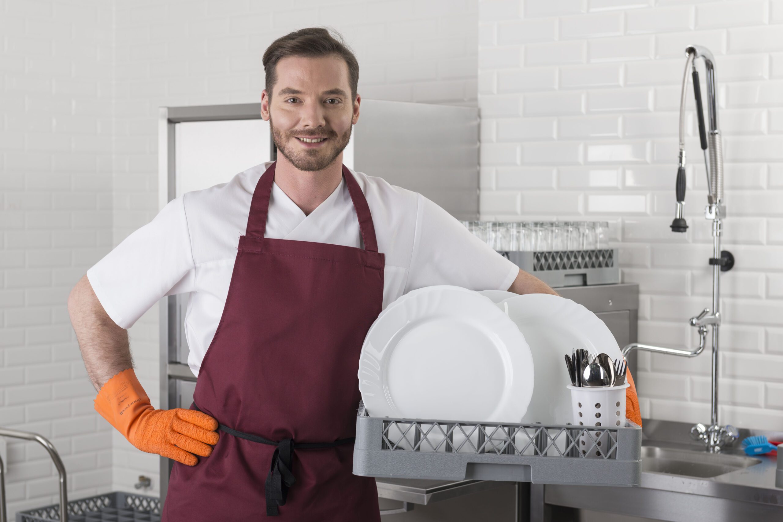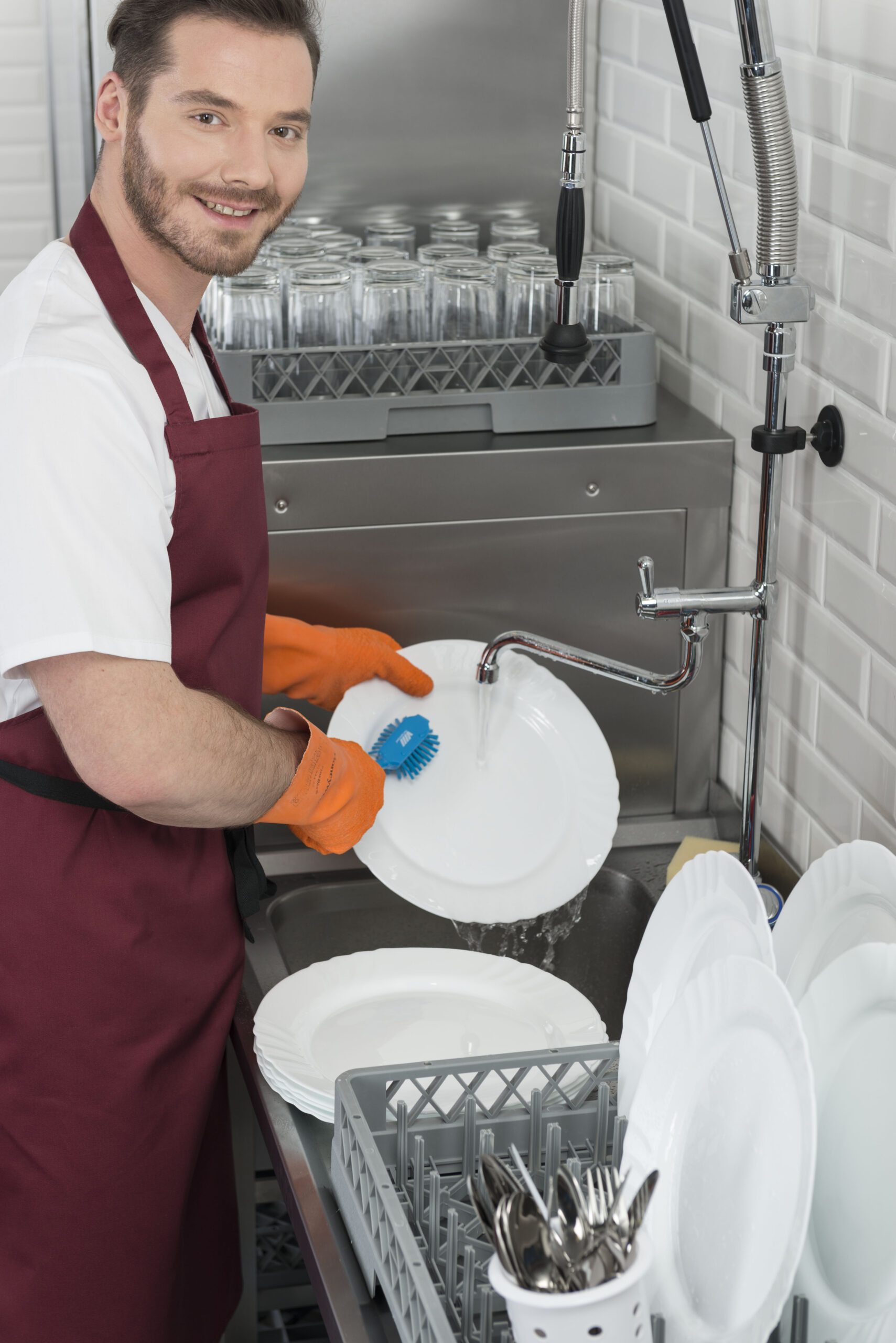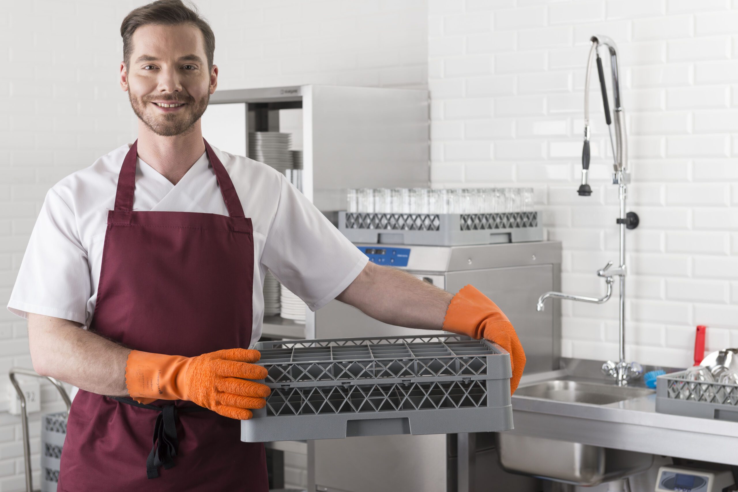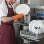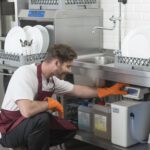 - Правилото “Мръсно-Чисто”: Трябва ви “Входяща маса” с мивка и душ за предварително отмиване (Pre-wash) и “Изходяща маса” за изсъхване на чистите кошници. Това създава поточна линия, където мръсните и чистите съдове никога не се срещат.