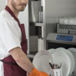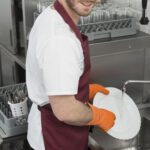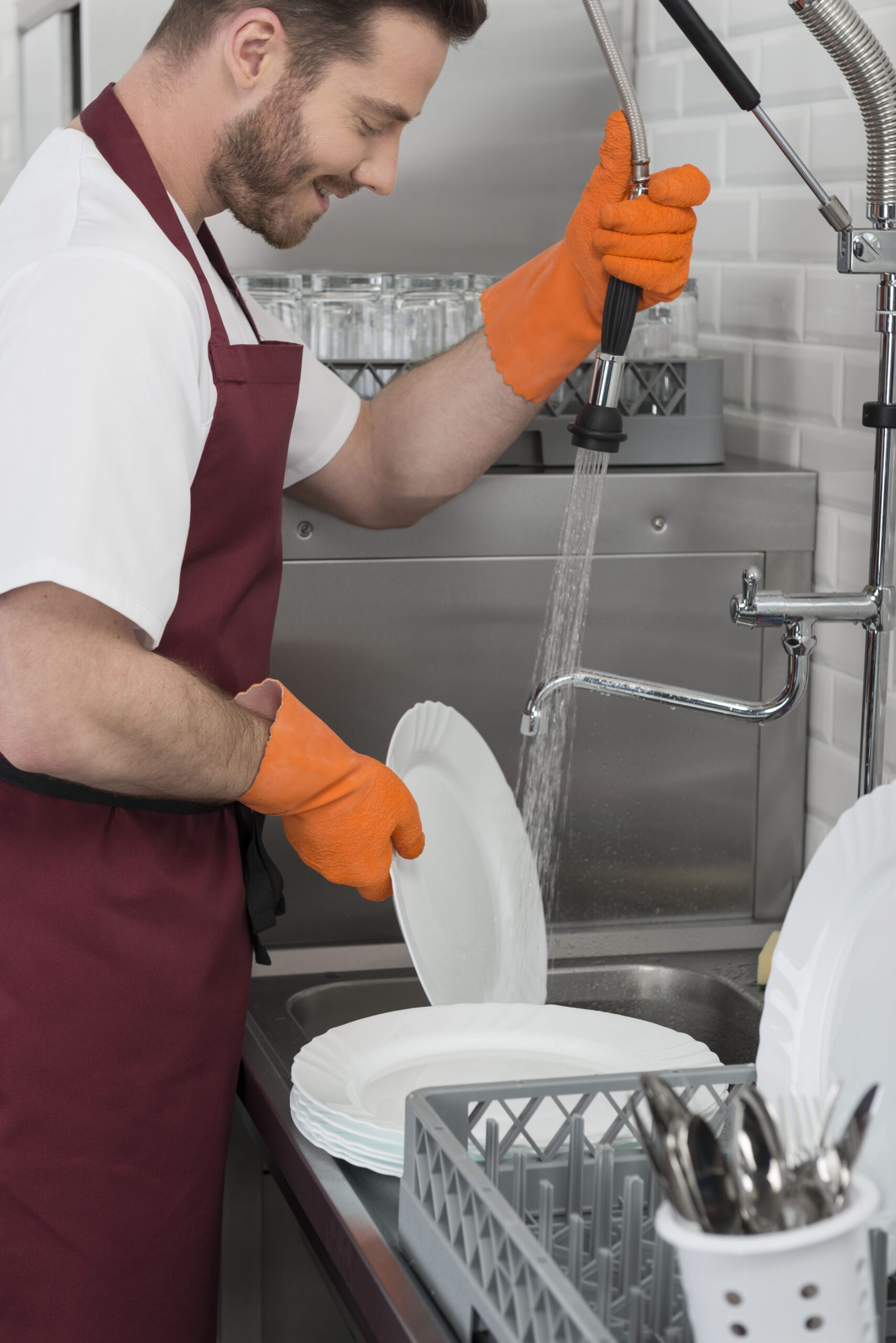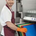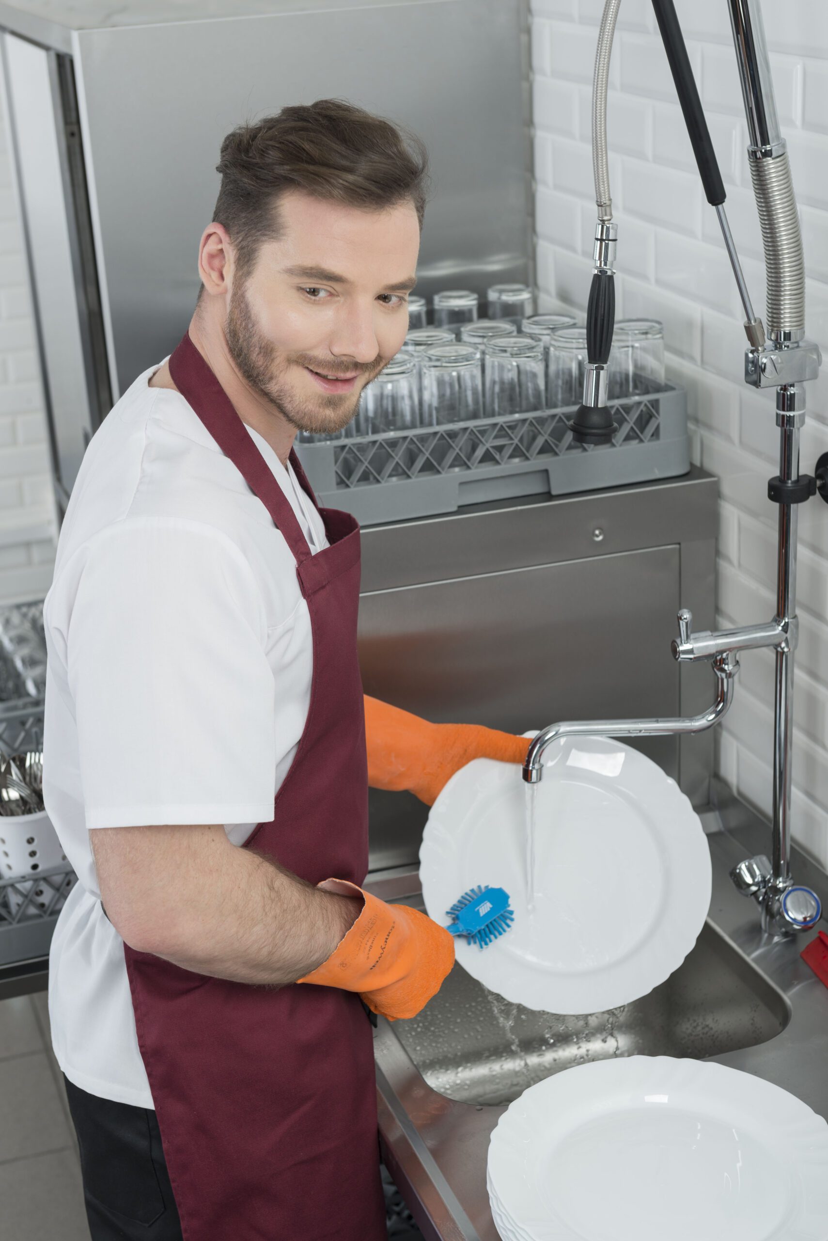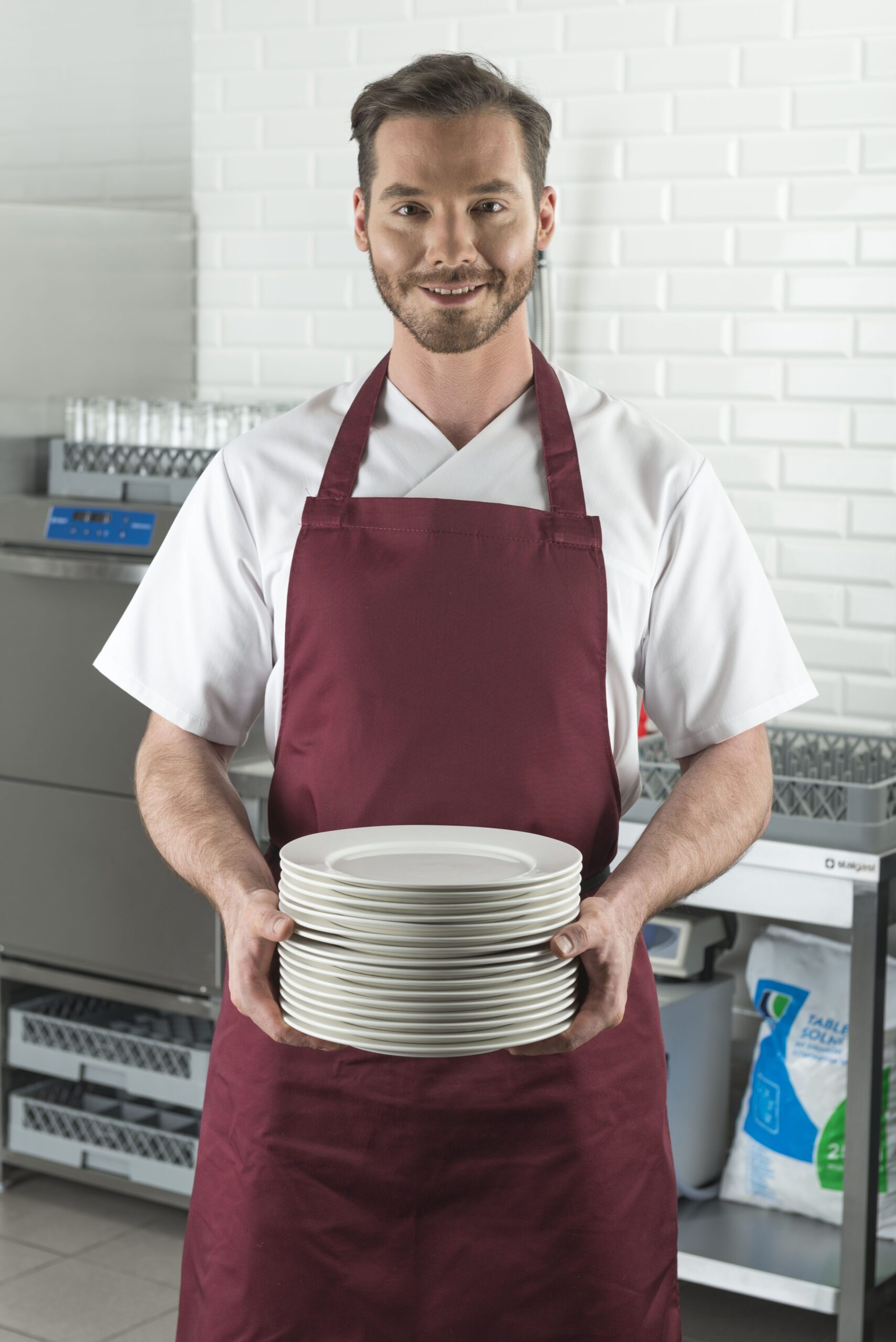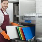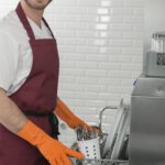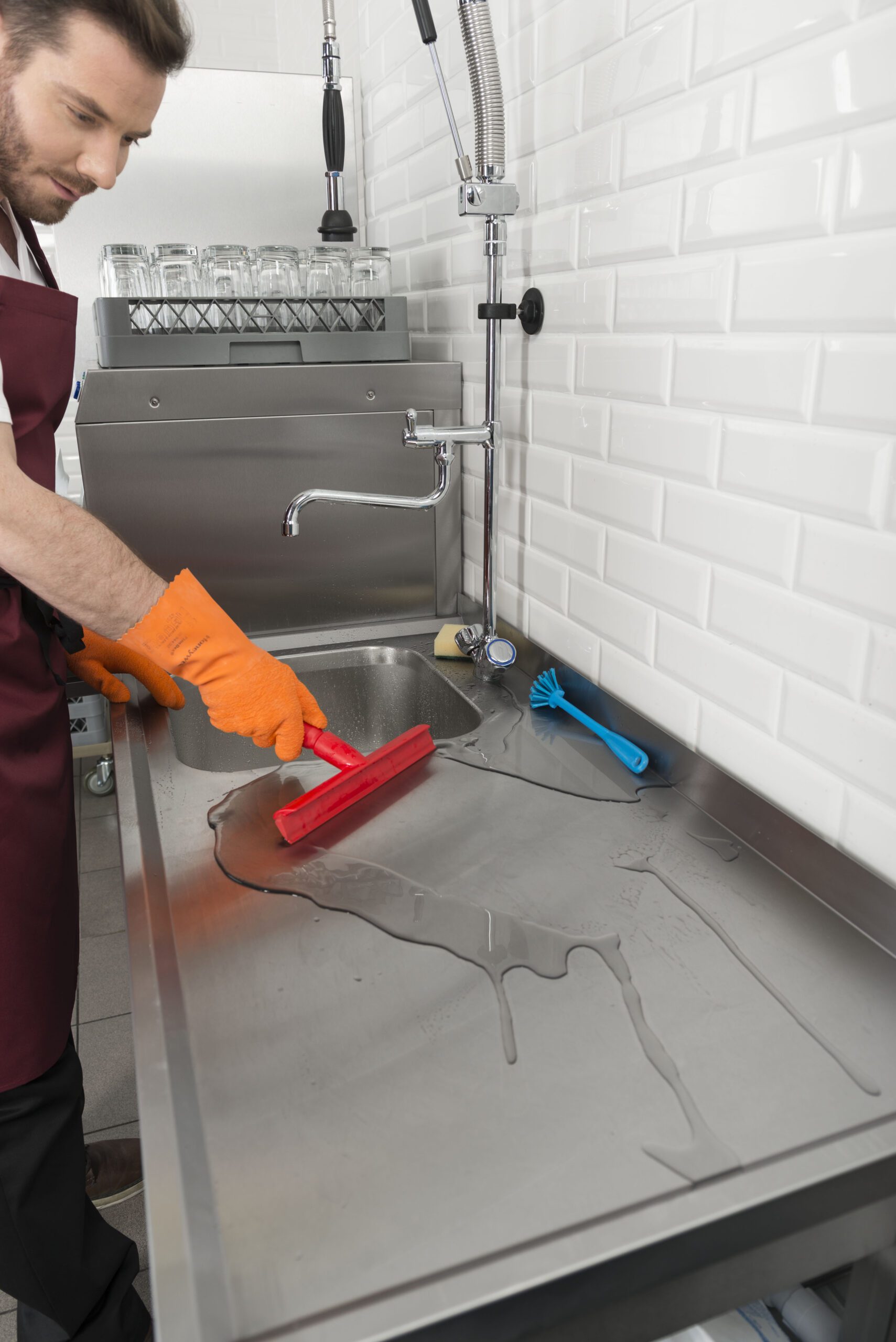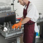 - Правилото “Мръсно-Чисто”: Трябва ви “Входяща маса” с мивка и душ за предварително отмиване (Pre-wash) и “Изходяща маса” за изсъхване на чистите кошници. Това създава поточна линия, където мръсните и чистите съдове никога не се срещат.