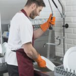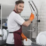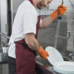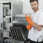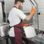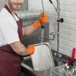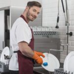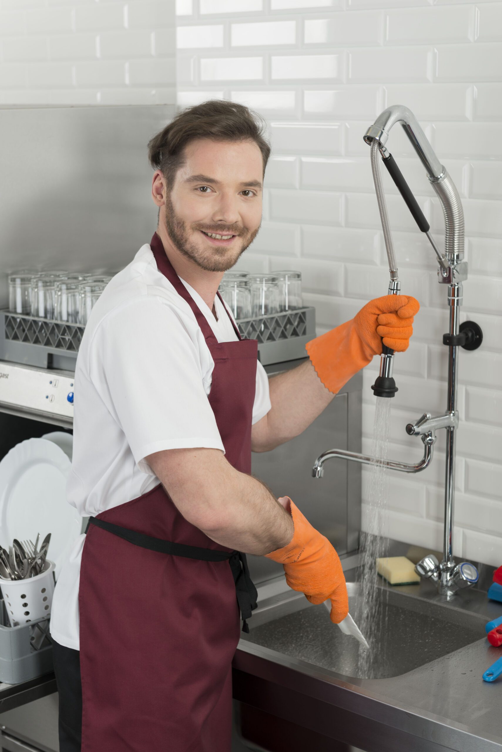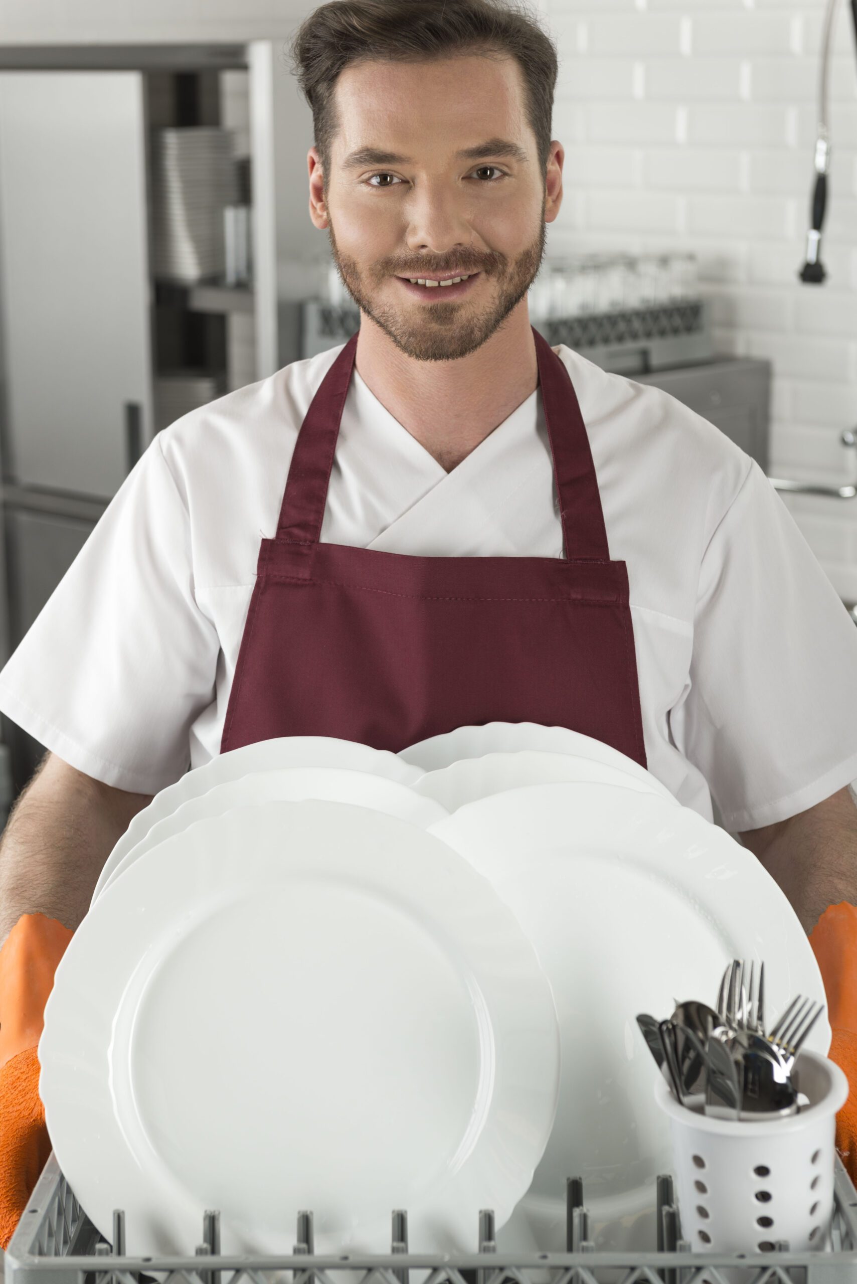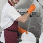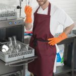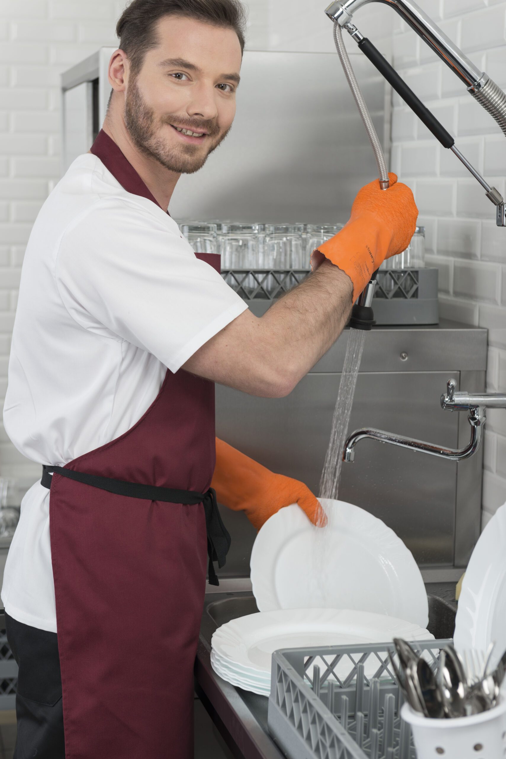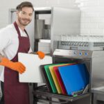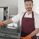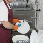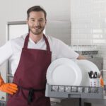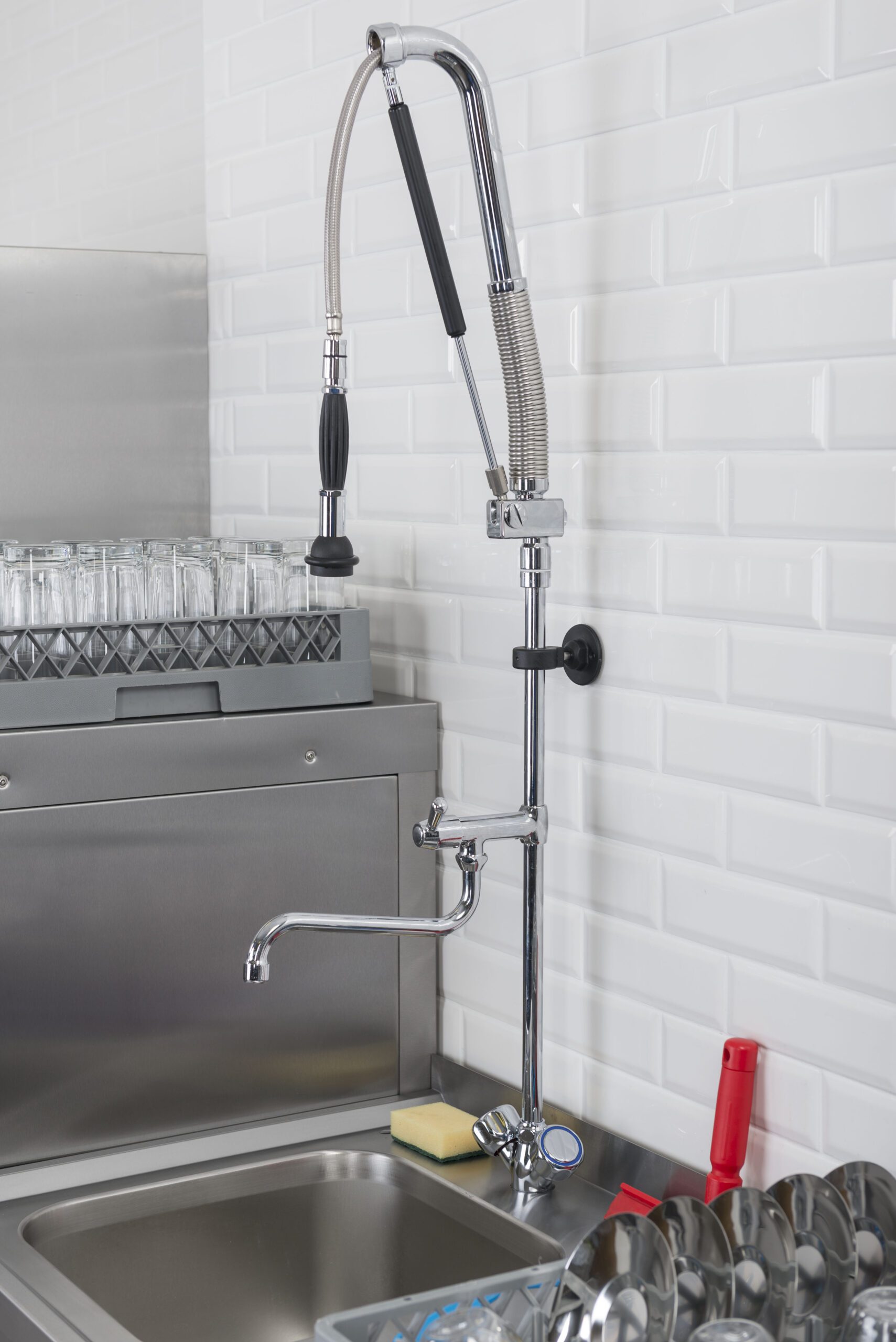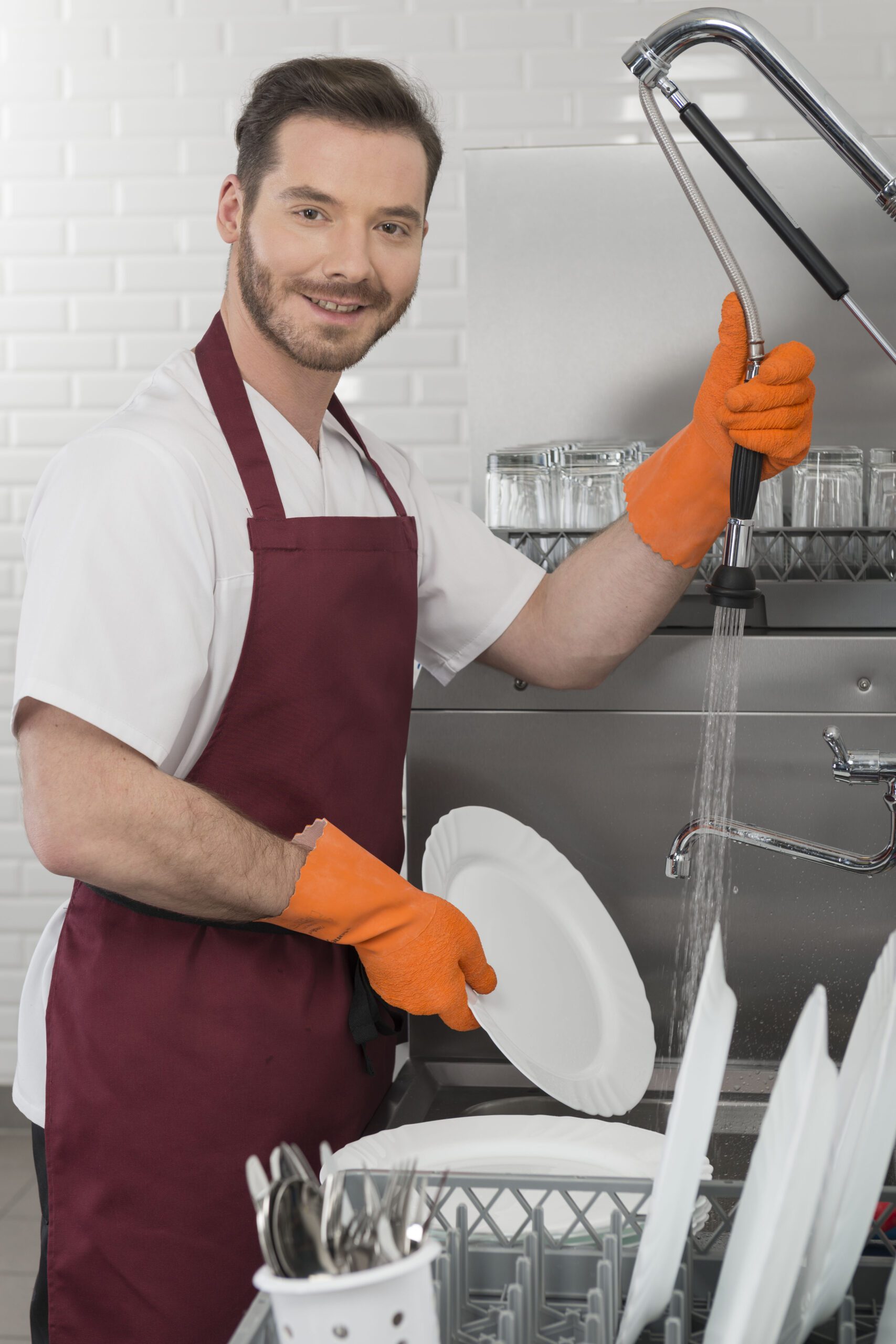 - Правилото “Мръсно-Чисто”: Трябва ви “Входяща маса” с мивка и душ за предварително отмиване (Pre-wash) и “Изходяща маса” за изсъхване на чистите кошници. Това създава поточна линия, където мръсните и чистите съдове никога не се срещат.